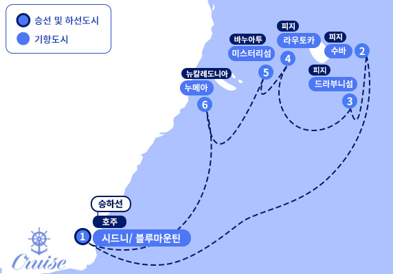 인천-시드니[호주] ▶ 수바[피지] ▶ 드라부니섬[피지] ▶ 라우토카[피지] ▶ 미스터리섬[바누아투] ▶ 누메아[뉴칼레도니아] ▶ 시드니/블루마운틴-인천